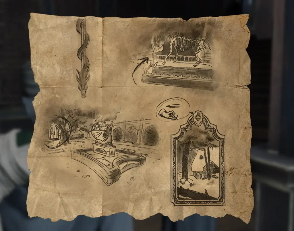 호그와트 레거시 퀘스트 중에 아서의 보물지도에서 랜드마크를 찾으라는 퀘스트가 있다. 이 그림을 힌트로 순서대로 찾아가기만 하면 되는데 아래 사진의 위치를 잘 참고해보자.