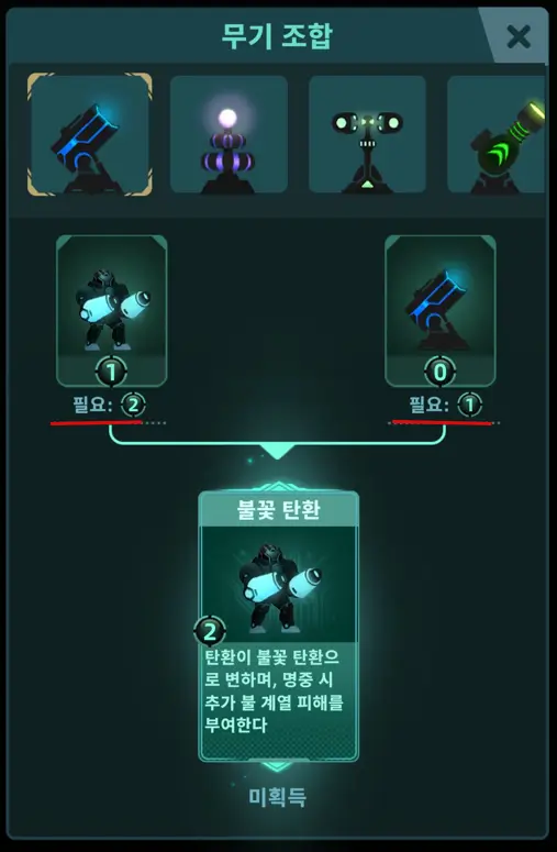 포대라는 항목에 들어가면 현재 활성화된 무기들을 볼 수 있는데 무기도 강화를 할 수 있다. 강화를 할 수록 전체적인 치명타 피해가 증폭될 뿐만 아니라 새로운 랭크무기가 해금된다.