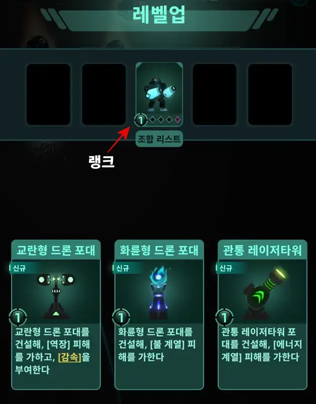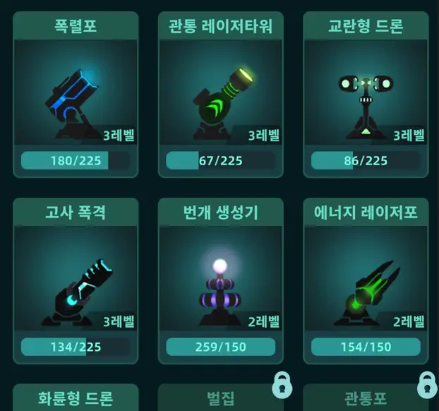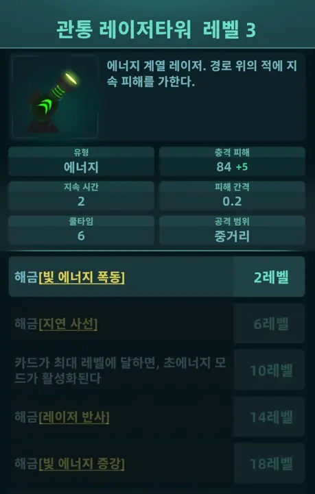그래도 추천한다면 관통 레이저타워와, 에너지 레이저포를 추천한다. 레이저타워의 관통능력과 레이저포의 높은 데미지로 옵션만 잘 쌓으면 스테이지를 퍼펙트로 클리어 하기가 수월해 진다.