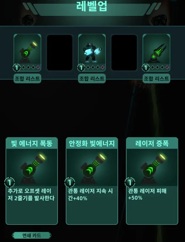 쿨타임을 줄이거나 지속시간을 늘리는 효율보다 데미지를 많이 주는게 스테이지 깨는데에 더 효율적이다. 초반에는 피해를 올려주는 옵션을 쌓아가면 데미지가 어마어마하게 올라간다. (초반엔 연쇄카드는 신경안쓰는 걸 추천한다)