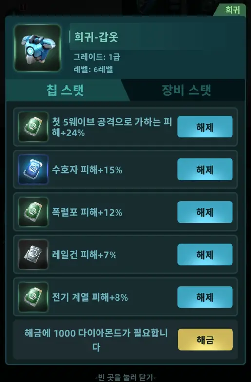장비에 장착할 수 있는 칩이라는 아이템이 있다. 이게 수호자 또는 무기별로 능력치를 올려주는 효과가 있다. 피해를 퍼센트로 올려주기 때문에 꼭 장착해야 하는 아이템이다.