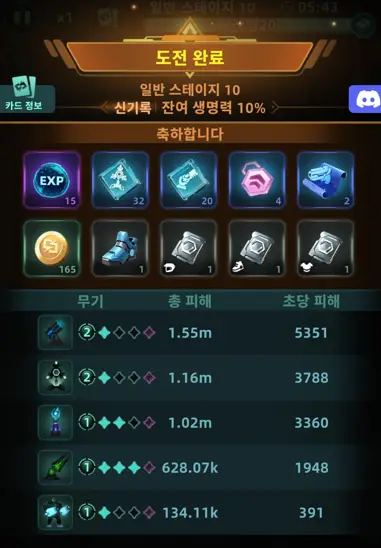 이렇게 진행하다보면 카드 운만 좀 받쳐주면 스테이지10도 클리어 할 수 있다. 사진에서도 볼 수 있듯이 화륜형과 폭렬포의 데미지가 많이 들어간 것을 볼 수 있다.
