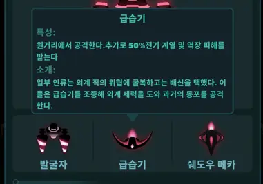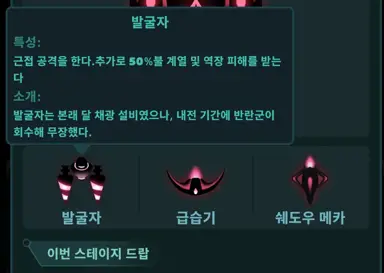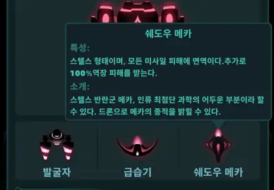 - 쉐도우 메카: 미사일 피해는 면역이고 추가 100% 역장 피해를 받음
