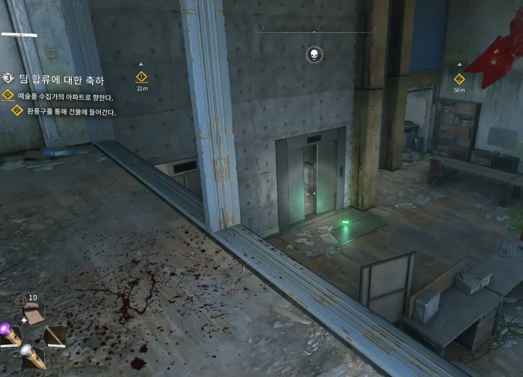 이 퀘스트에서는 퀘스트 표시 뜨는 건물 상부의 안쪽으로 보면 초록색 불이 앞에 놓여져 있는 엘레이터가 있는데 이곳으로 들어가 주면 된다.
