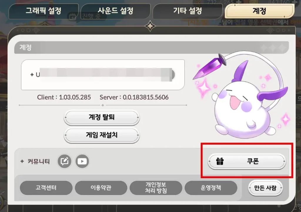 PC나 모바일에서 게임을 실행시키고 있다며 설정에서 [계정] 부분으로 들어가 주면 ‘쿠폰’ 버튼이 있다 이걸 누르고 나서 위에서 봤던 코드를 입력하기만 하면 된다.