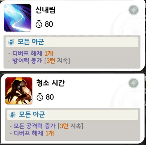 신내림과 청소시간이라는 스킬은 영웅들의 적용시점을 잘 보고 해제할때 잘 써주면 된다.