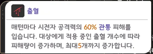 출혈효과는 매턴마다 시전한 영웅 공격력의 60% 관통 피해를 주기 때문에 많은 딜을 넣을 수가 있고, 최대 5개까지 증가하면서 개수가 많아질 수록 피해가 더 커진다는 것이다.