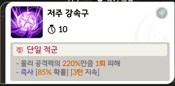 즉사: 매턴마다 대상 현재 생명력에 20%의 피해를 입으며, 마지막 턴에는 즉시 사망합니다. 즉사 2회 중첩 시 즉시 사망합니다.