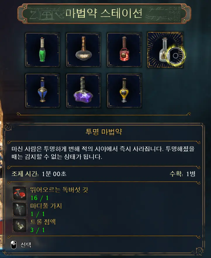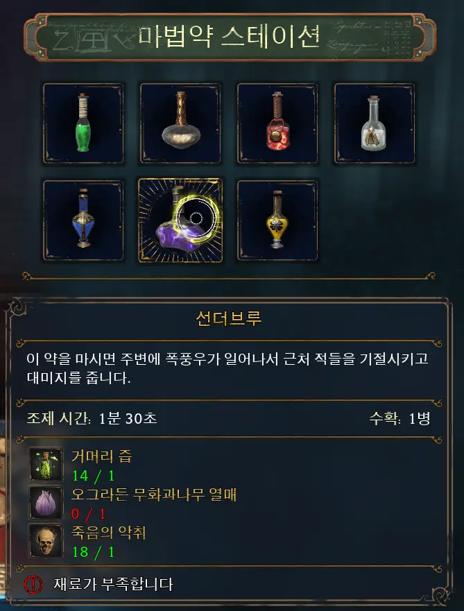 이 두가지 마법약은 제조할수도 있고 구매할 수도 있는데 J.피핀의 마법약 상점에서 구매할 수 있다. 만약 바로 구매하지 않고 제조할 예정이라면 아래 재료가 있는지 확인하자.