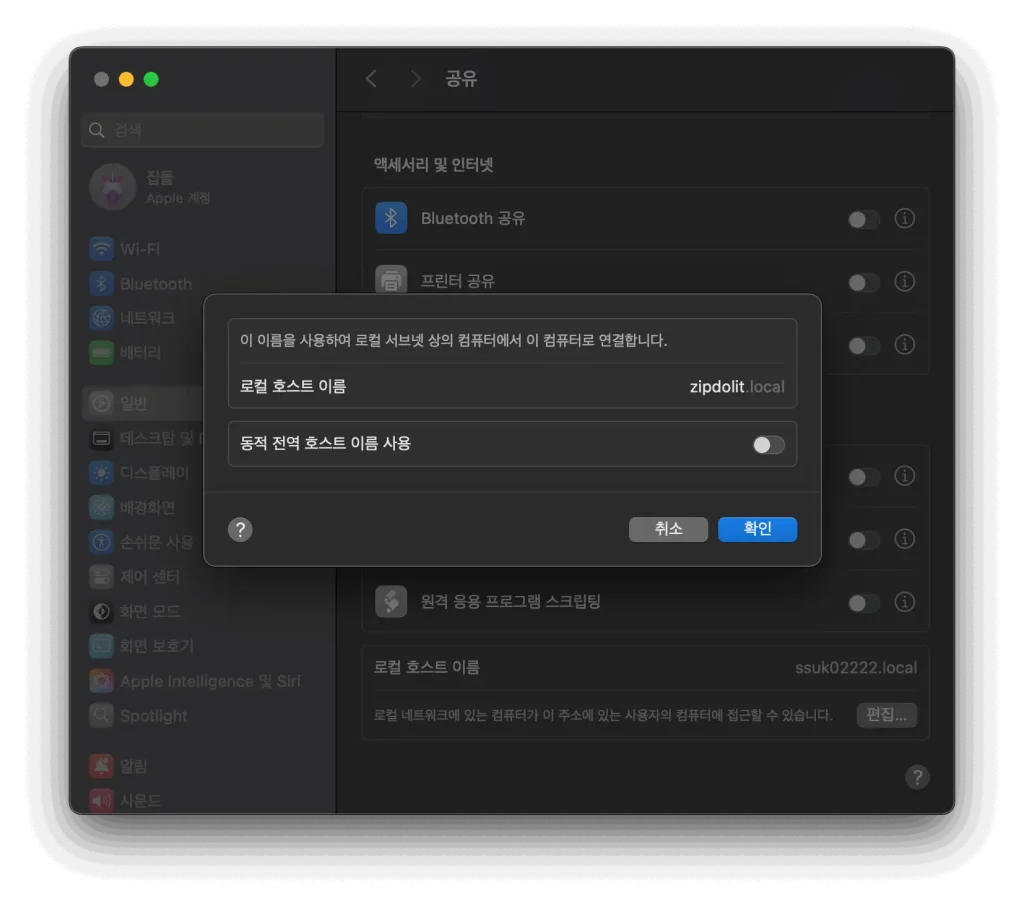 홈 IT-Tip Apple[Mac] 컴퓨터 이름(로컬호스트) 변경하는 방법2025년 06월 02일 맥을 쓰면서 로컬호스트, 즉 컴퓨터의 이름을 변경하고 싶다면 아래 방법을 그대로 따라하면 된다.화면 상단의 애플로고를 클릭한 다음에 [시스템 설정]을 눌러주자.그리고 [일반] -> 로컬 호스트 이름의 [편집] 클릭.여기 원하는 이름으로 변경한 다음에 확인만 눌러주면 끝이다. 공유하기 클립보드에 복사 Facebook에 공유 X (Twitter)에 공유 Threads에 공유 solonam 이전 글 [Mac] 사용자이름(계정) 변경하는 방법 다음 글 2025 맥북 시리즈 출시년도와 탑재된 CPU/GPU 및 특징 댓글 남기기 답글 취소 이메일 주소는 공개되지 않습니다. 필수 필드는 *로 표시됩니다 이름 댓글 달기 * 이메일 댓글 달기 관련 글2025년 가장 가성비 모델의 맥북은 뭘까?2025년 04월 23일2024 9월 애플 이벤트 간단 요약, 가격은 모두 동결?!2024년 09월 11일맥북에어M2 13인치 15인치 비교, 어떤 선택이 좋을까2023년 12월 14일